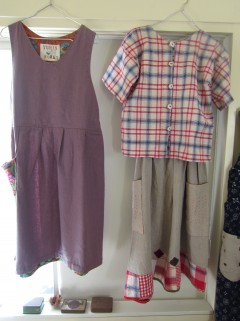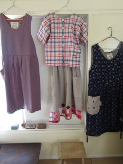 早川ユミさん ・麻ワンピース(紫) ¥38,000 ・タイの農民服 ¥38,000 ・つぎはぎスカート ¥35,000