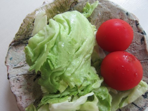 キム・ホノさんのゴツゴツしたぶ厚いお皿に 新鮮野菜を載せて~。 楽しい朝のサラダ皿です。