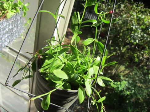 赤い花をつけながら、つるがぐんぐん伸びています。