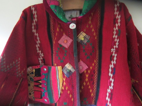 早川ユミさんの カチン族手織り赤いジャケットです。 お客様のご希望で、 前立てにひし形のパッチ布を つけて頂きました~。