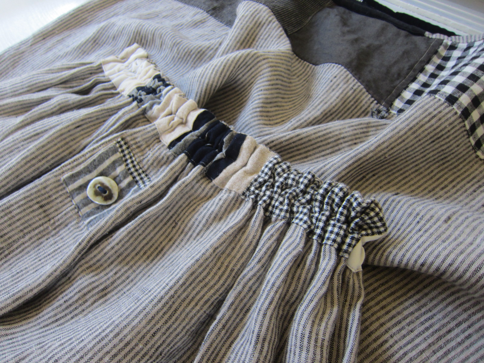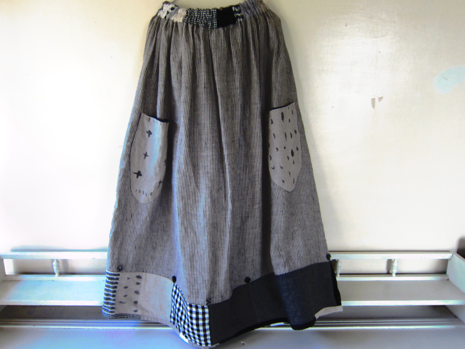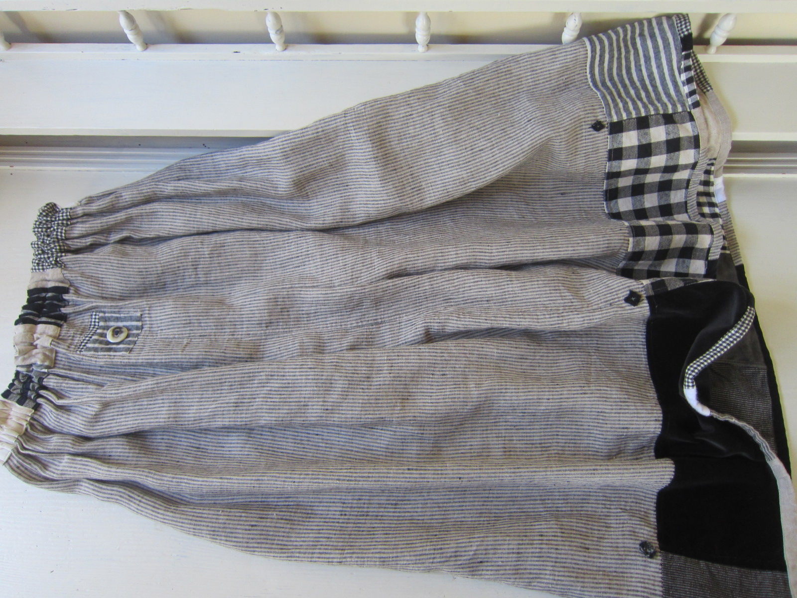 ウエストベルトや、裾のつぎはぎワークはとても素敵です!