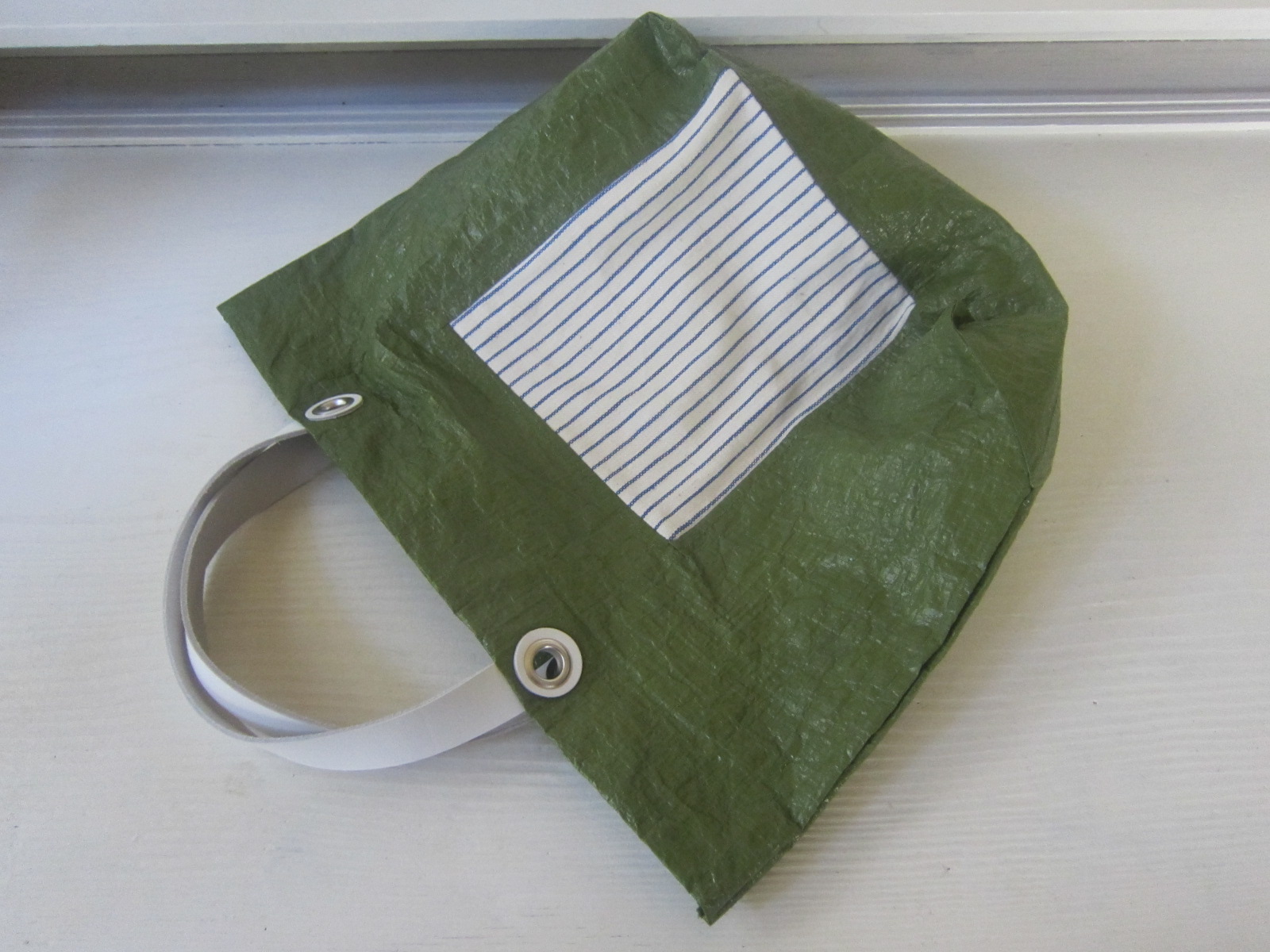 きれいなグリーンのビニール素材です。 布は古いもの。ブルーのストライプが素敵です!