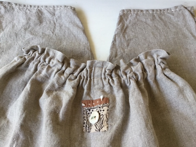 茶の柿渋ポケットが2つついています。 裾は白いちくちくステッチがお洒落です! ザックリした生成りの麻が気持ちいいです~。 是非、お試しください。