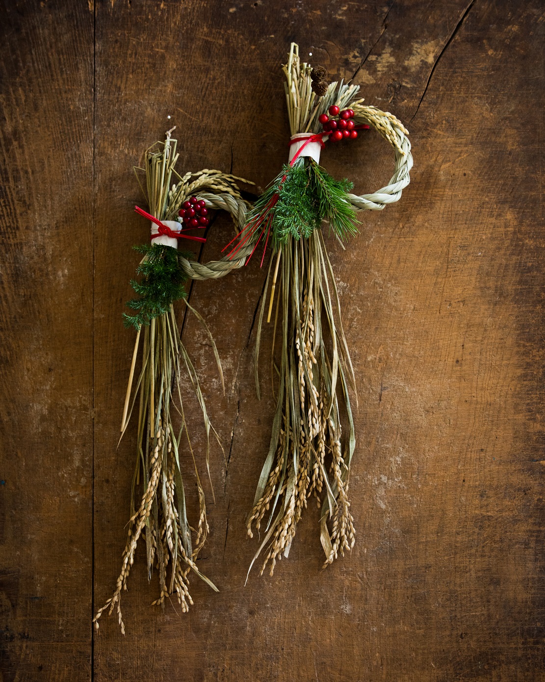 稲穂を下に配置し、しめ縄は手前に浮いているような感じで固定しています(斜めに固定)