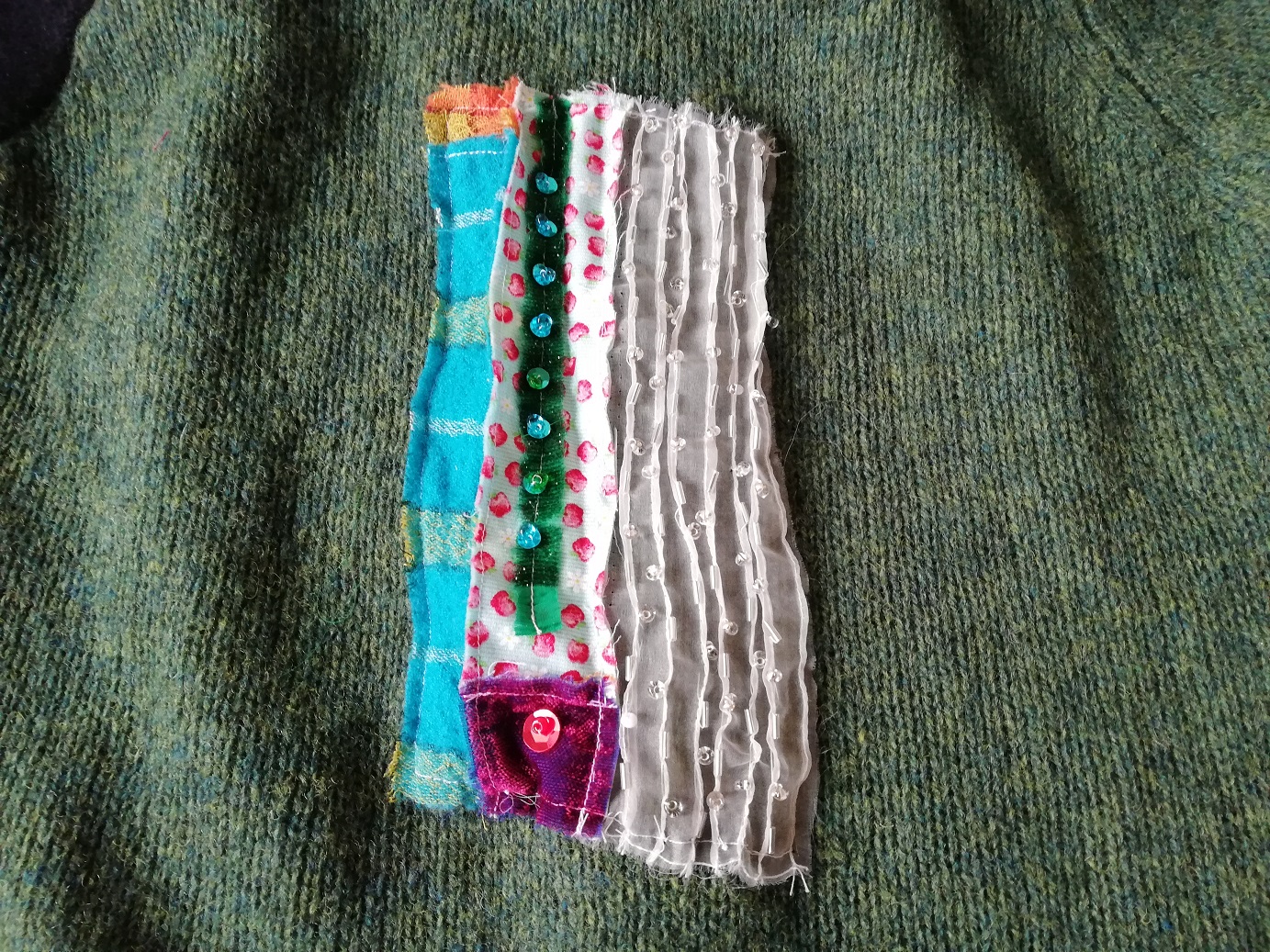 お衿はビロード、パッチワークのポケット、ビーズ、スパンコールを