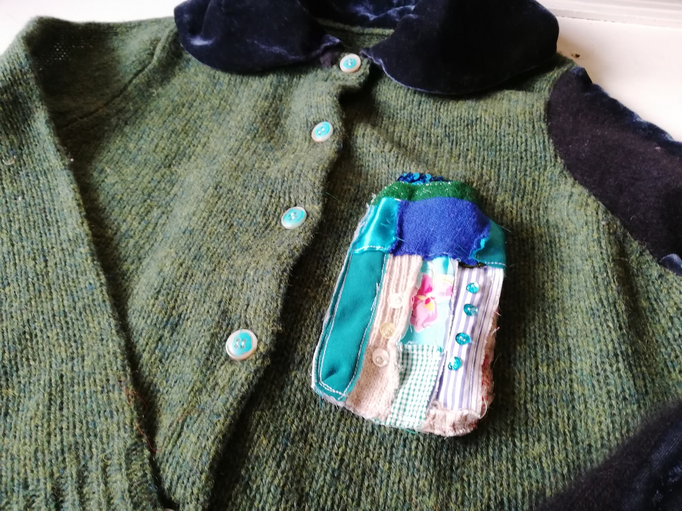 ウール素材のカーディガンに素敵にリメイクされています。