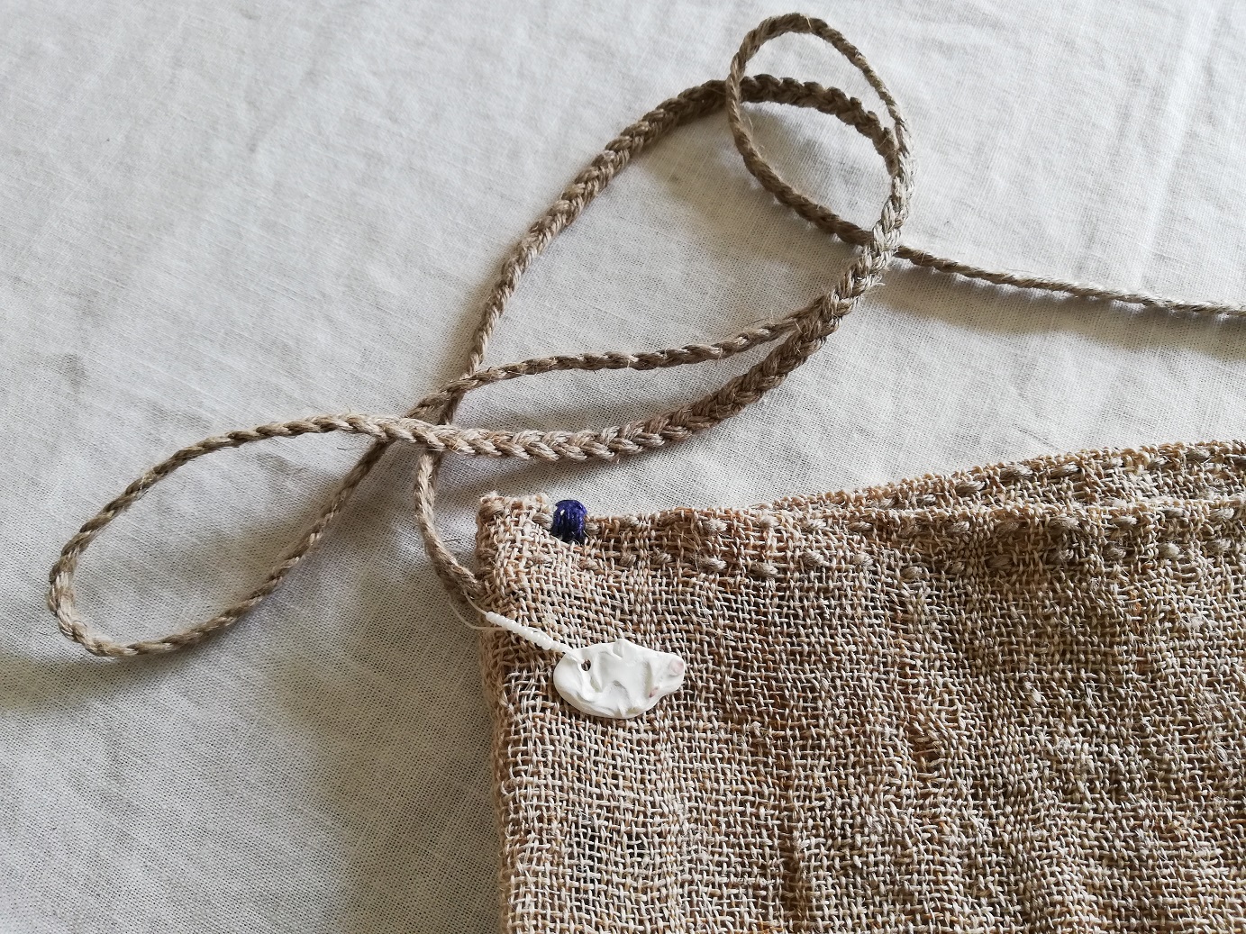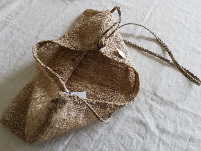 藍染め麻のステッチ、三つ編みの肩ひもはスエーデンの麻紐~軍未使用の物。