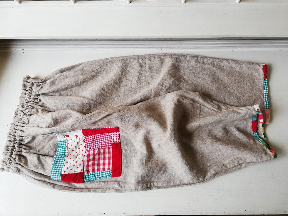 に素朴な生成り麻にカラフルな布ワークが