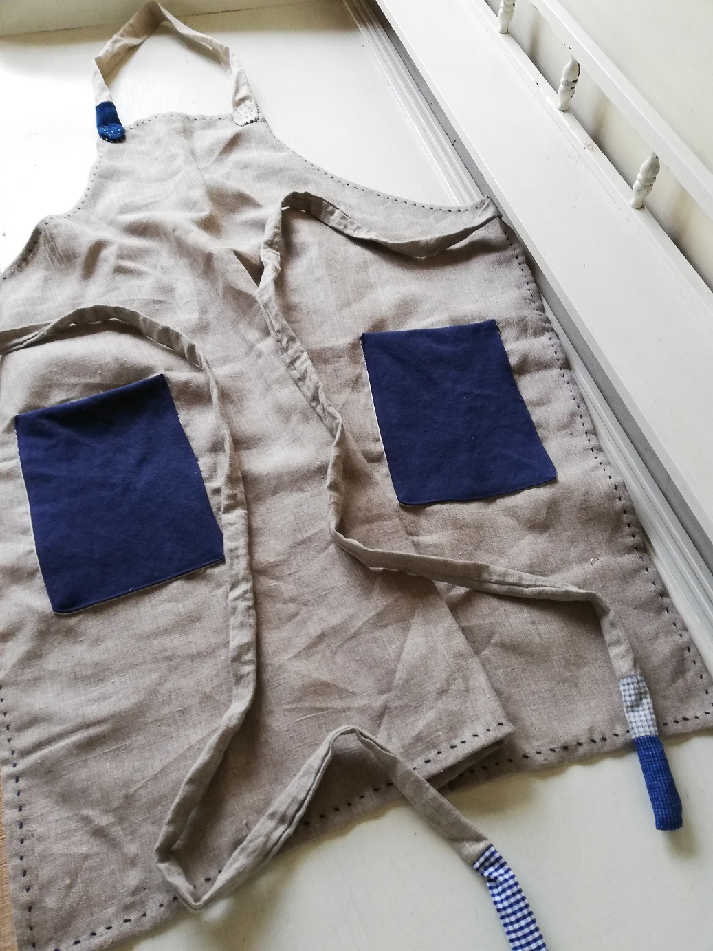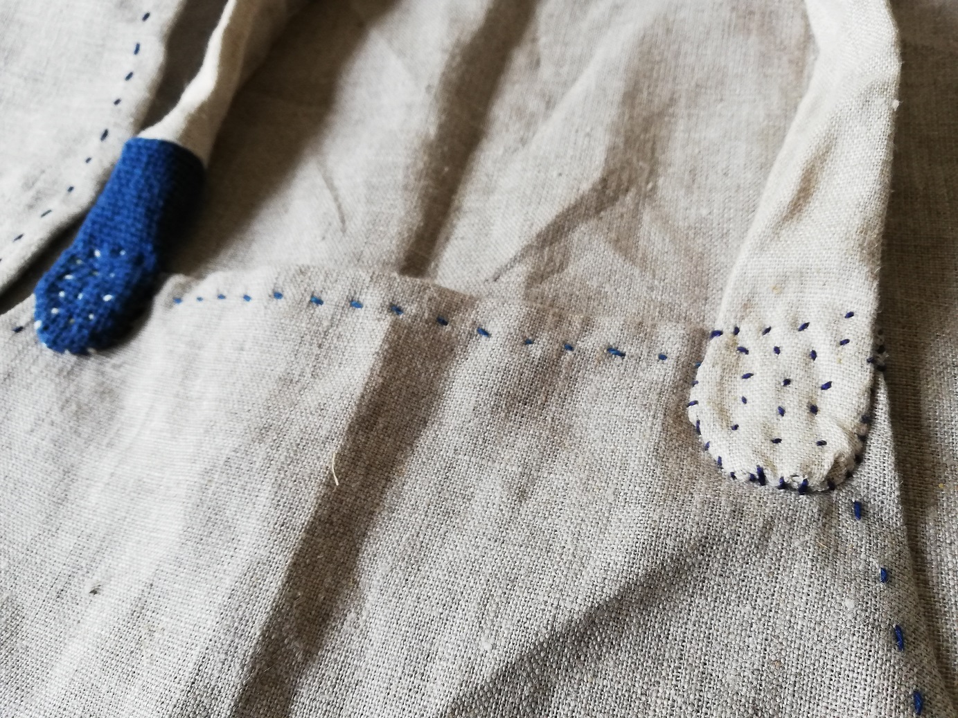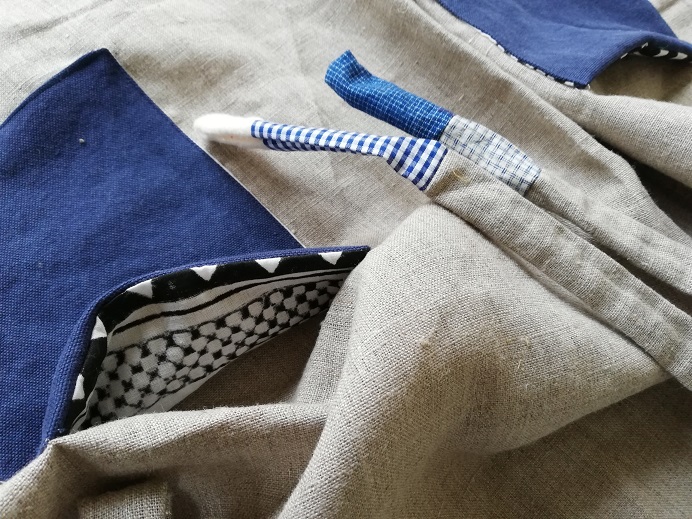 早川ユミ 麻手縫いちくちくエプロン(青ポケット)