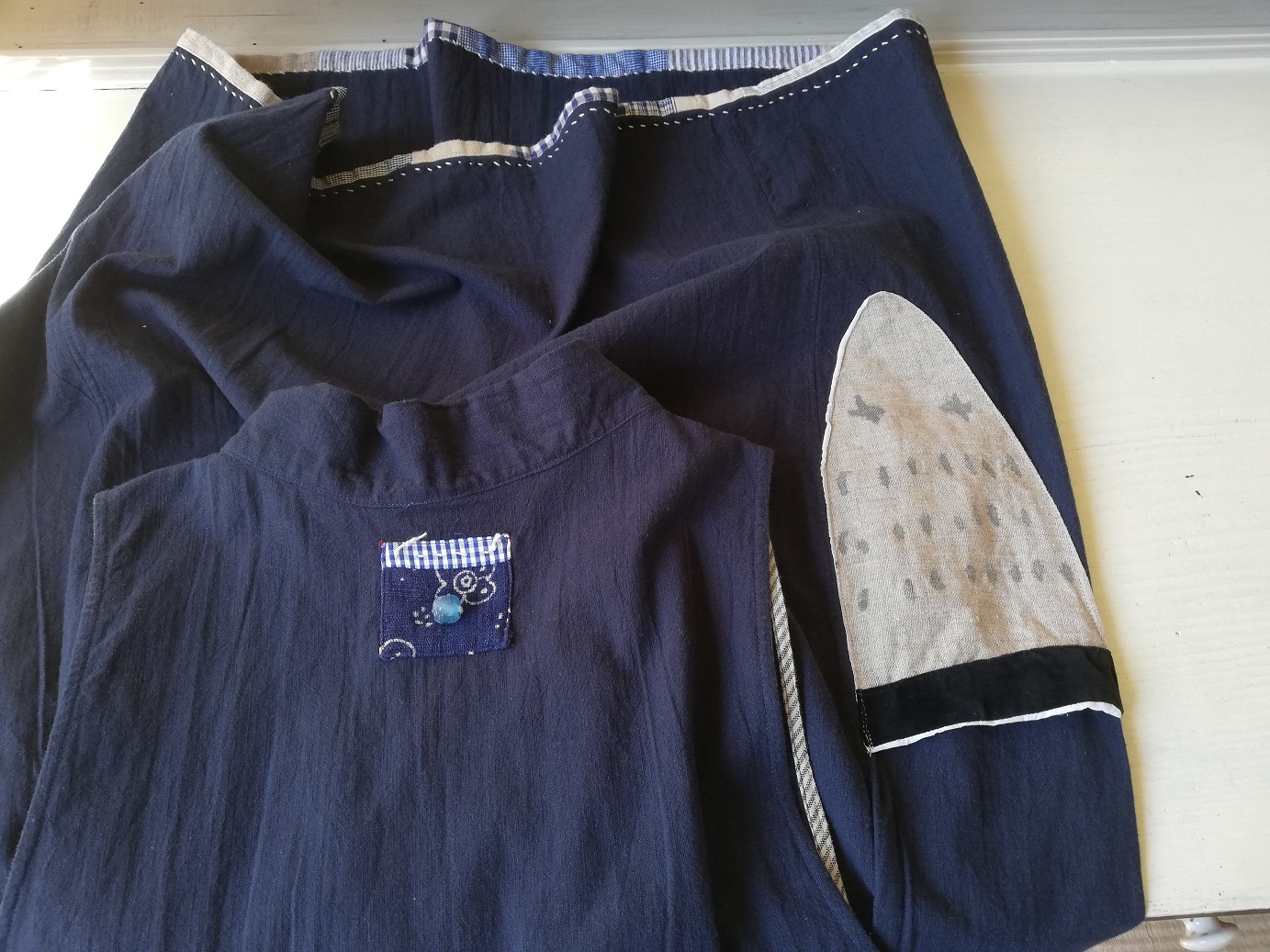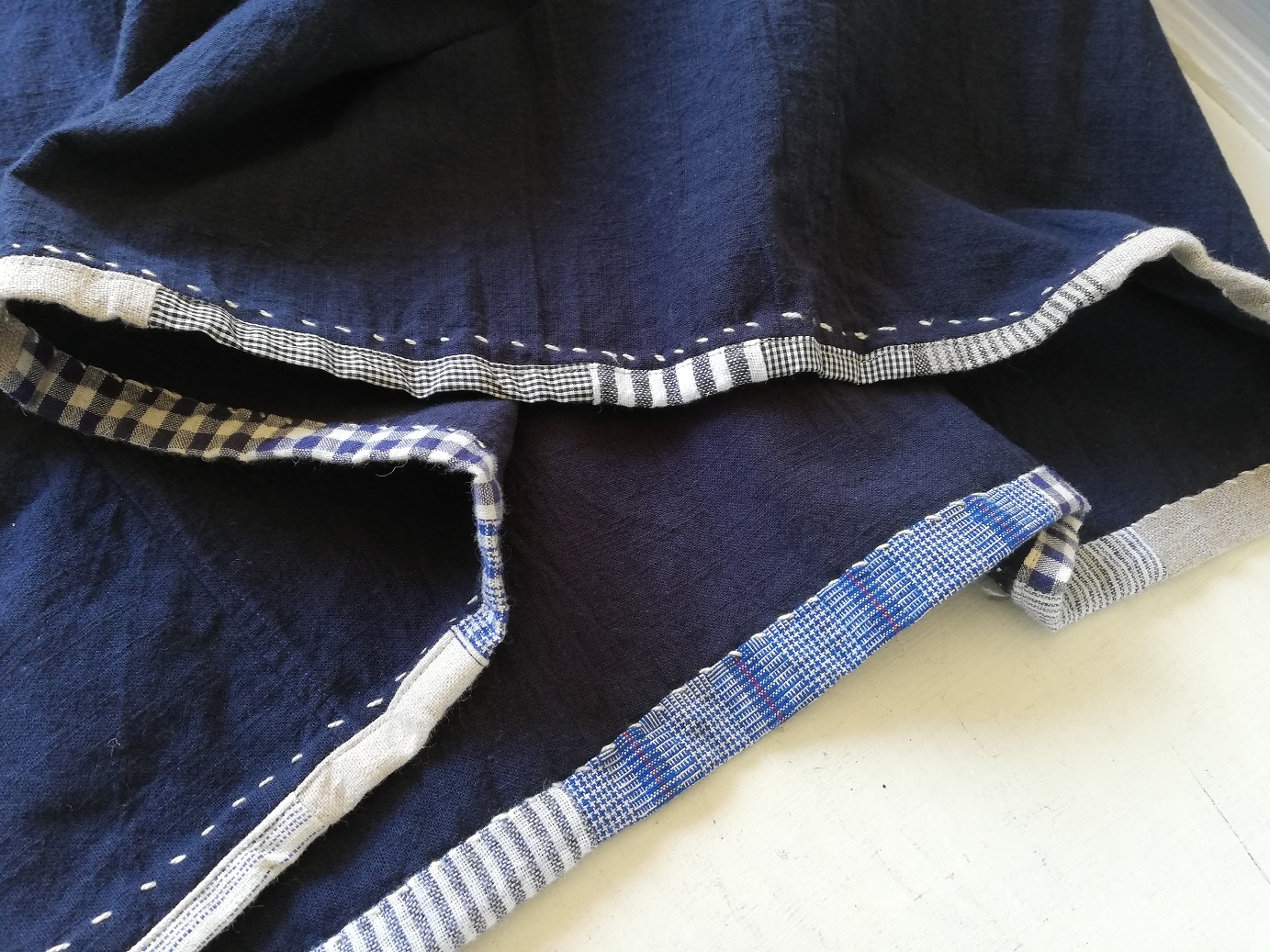裾は上海木綿でくるみ 白いステッチ。 とても凝った布ワークです。 切り替えは少しローウエストです。
