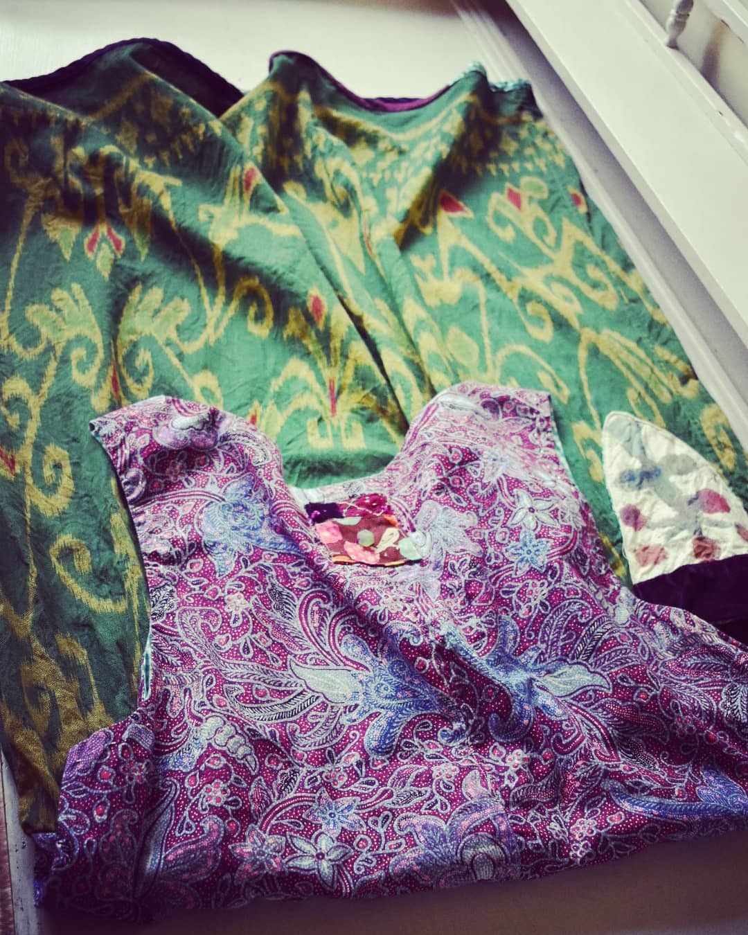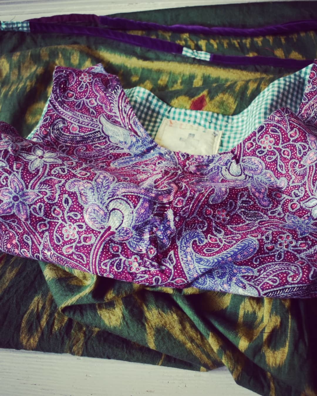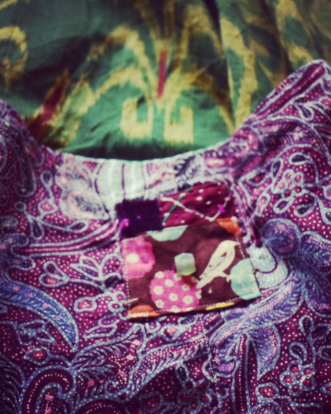 緑色のミャンマーの絣布と 紫色のインドネシアの更紗 とても神秘的な組み合わせです。 是非、お試しくださいませ。
