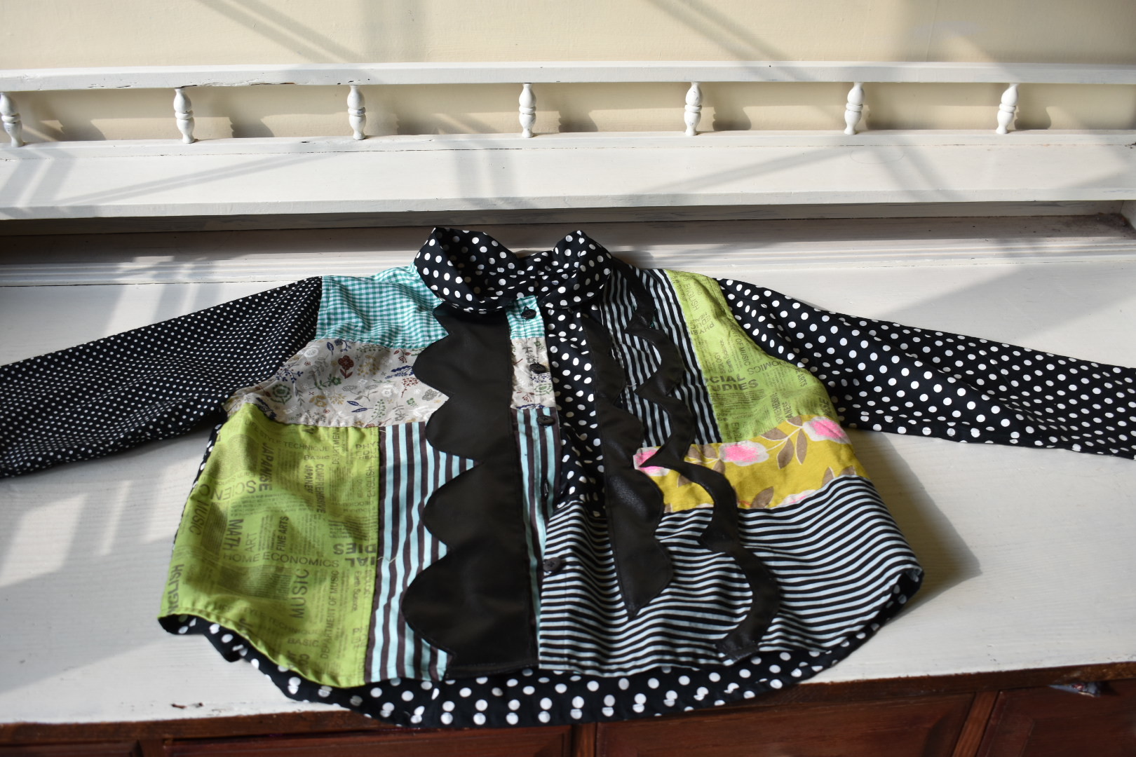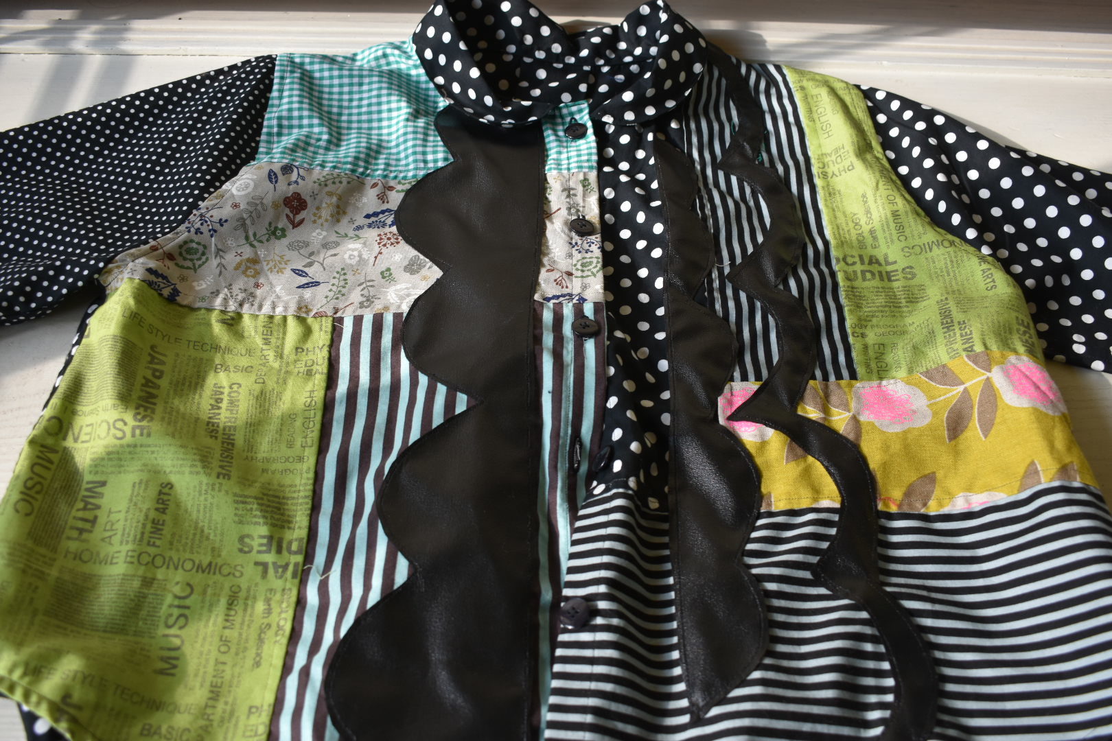 前身頃のいろいろな布のコラージュが 素敵です~。