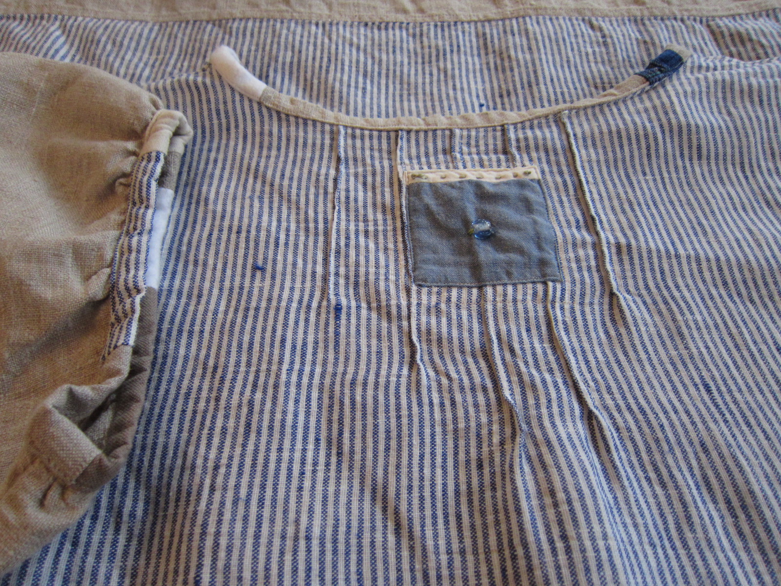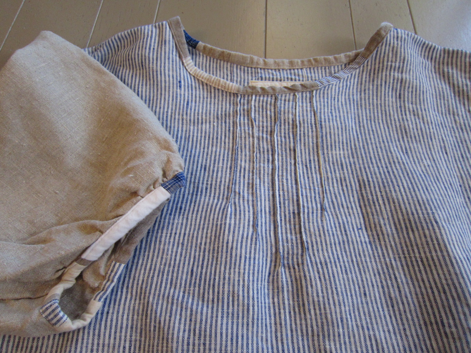 ブルーと白のストライプのリトアニア麻スモック。 裾の切り替えと袖は生成りの麻です。