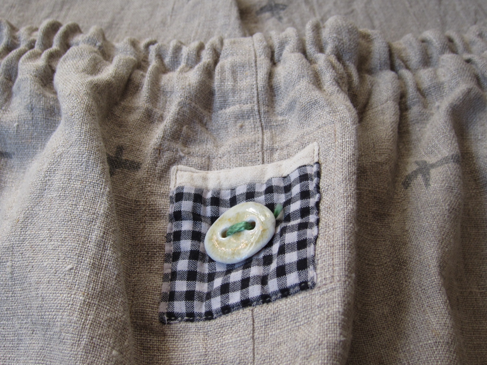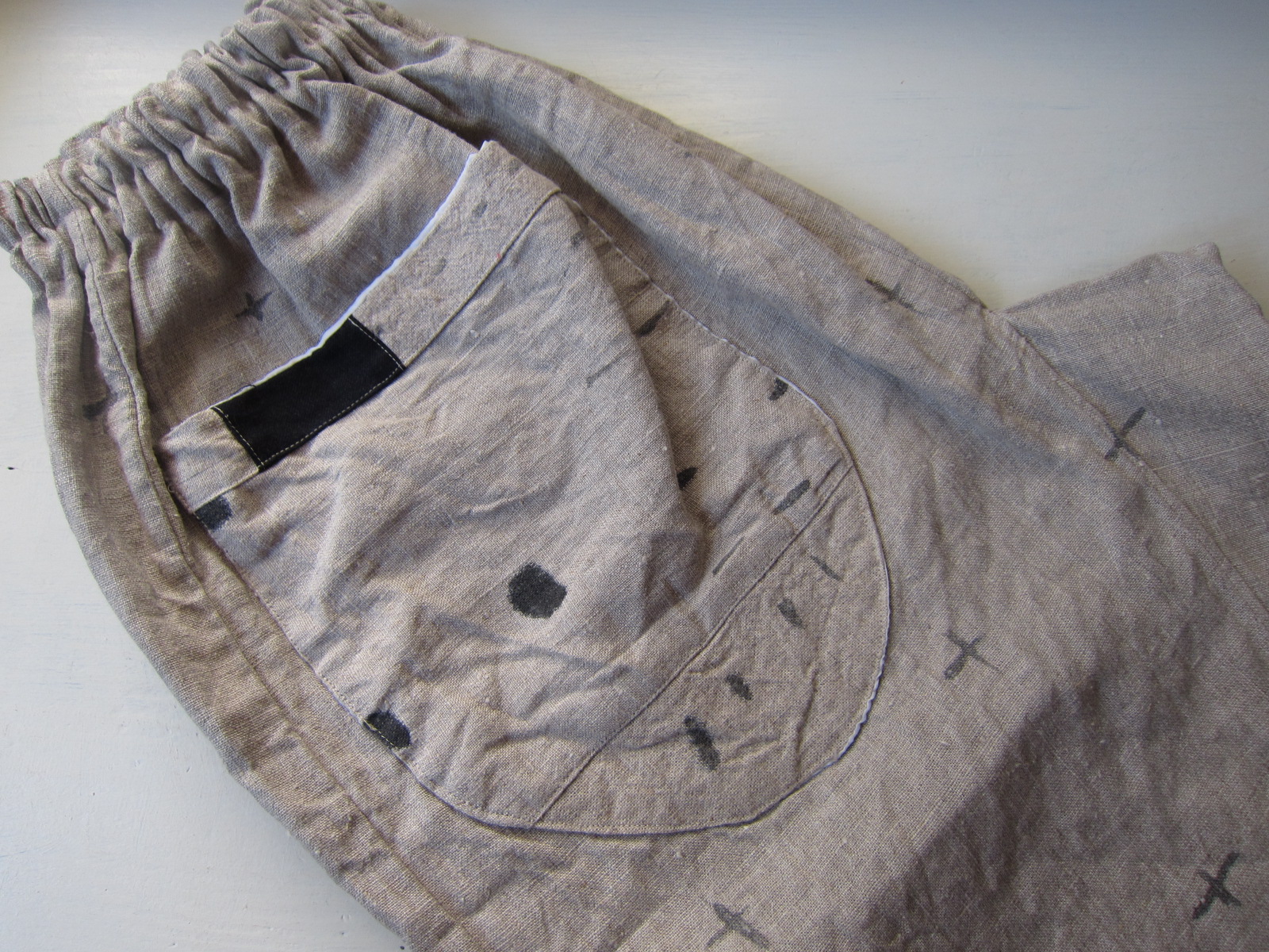 ざっくりした麻に墨のてんてん模様がはいっています。