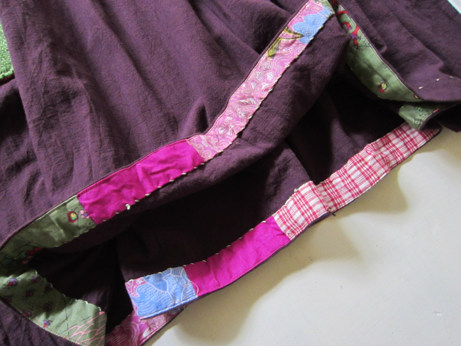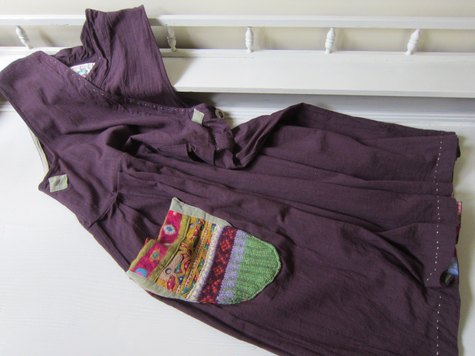 美しい紫のチベッタンワンピースです。 アートなポケット・裾や打ち合わせの裏布はカラフルなパッチワークが素敵です! 脇の白いボタンはユミさんの手作りです。 是非 お試しください。