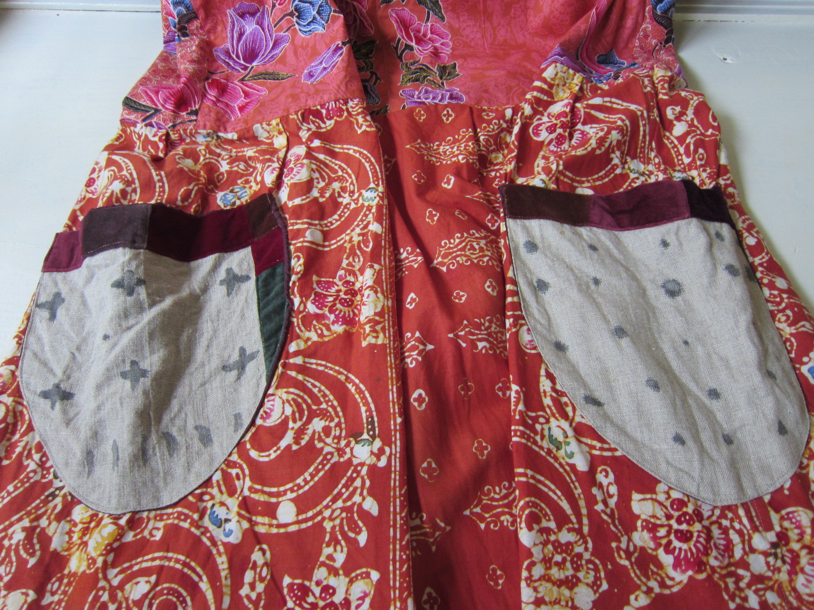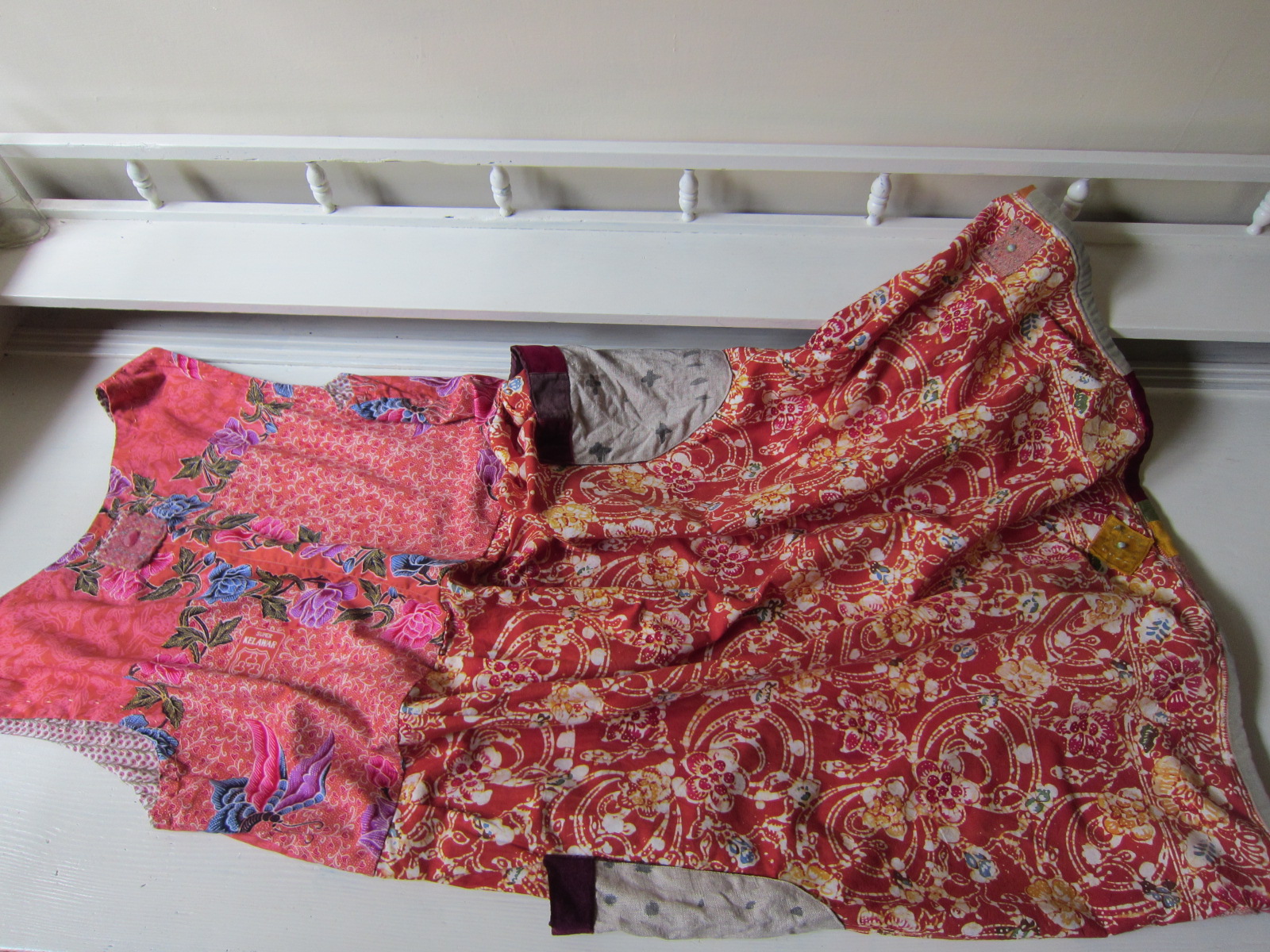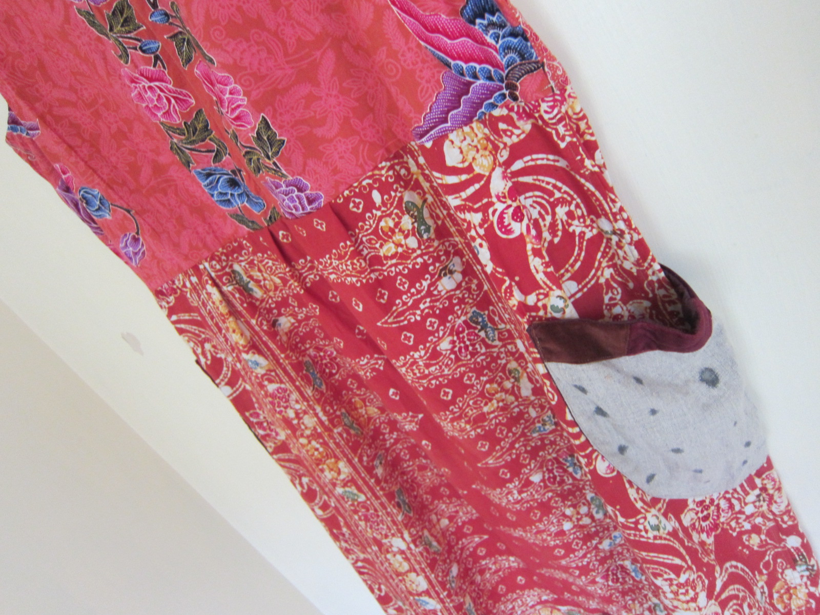 ピンク系とオレンジ系のジャワ更紗の組み合わせは ユミさんならでわの素敵なコンビネーションで、 とても素敵です。 下に組み合わせるものによってオールシーズン 活躍しそうです~。