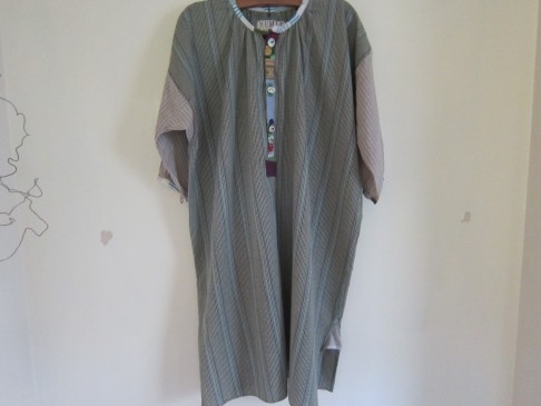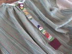 前立てのつぎはぎ布に紫・グリーン・赤の ボタンホールが素敵です。 身頃はグリーン系とオレンジの細かいストライプ。 やわらかい布地は旅着にピッタリ。 どこか旅に出たくなります~。