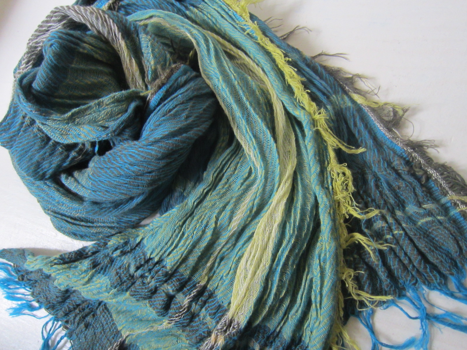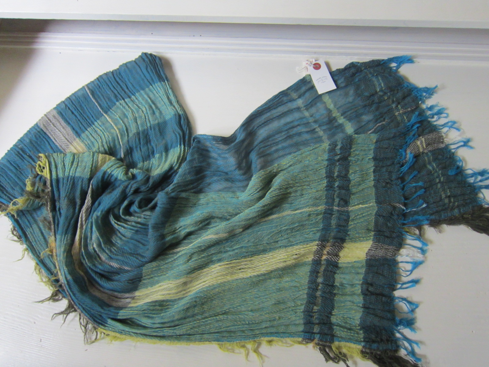 ガーゼのような柔らかい肌触りでとても気持ちいいです! 緑・ブルー・黄色の織がとてもきれいです~。 是非、お試しくださいませ。