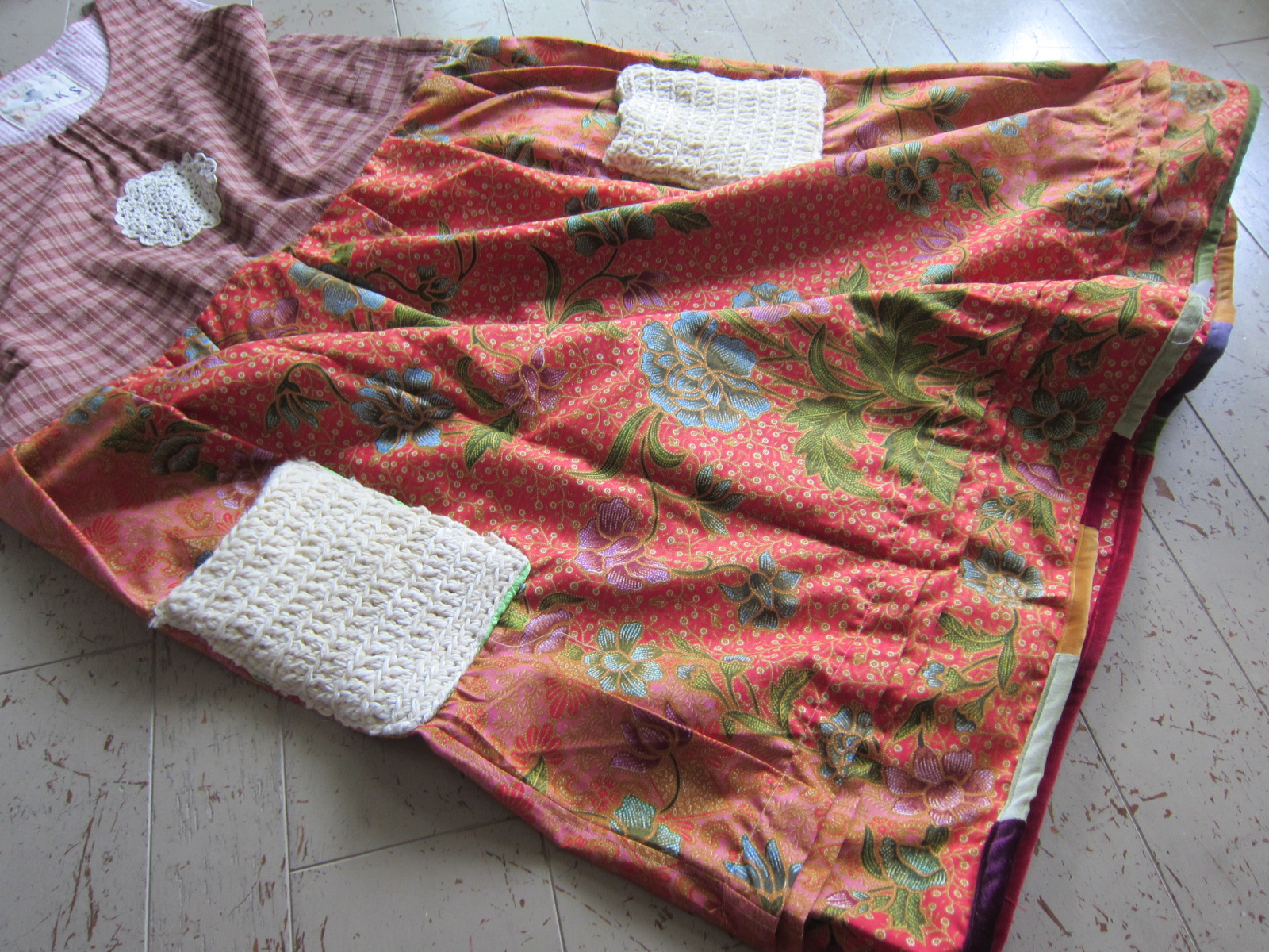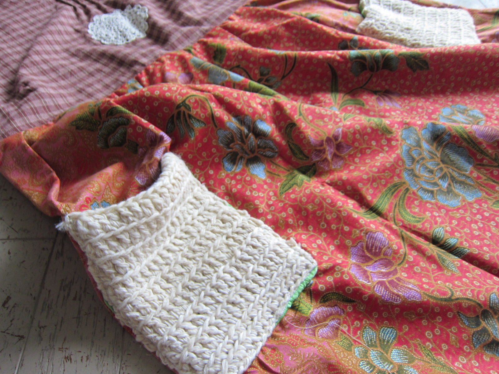 白いニットがアクセントのポケットと胸当てが とてもおしゃれです! 身頃は二重になっていますので これからの季節に重宝しそうです。