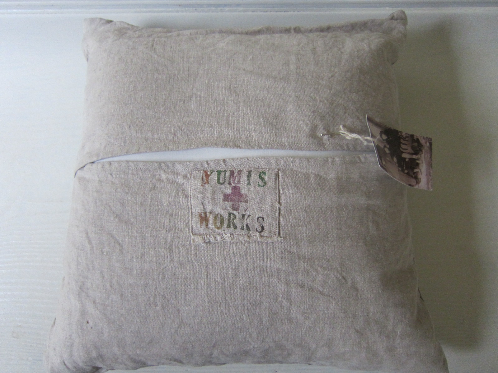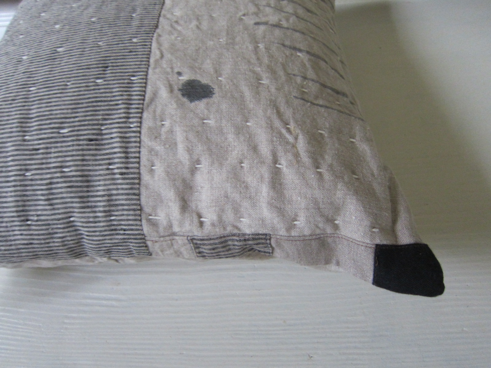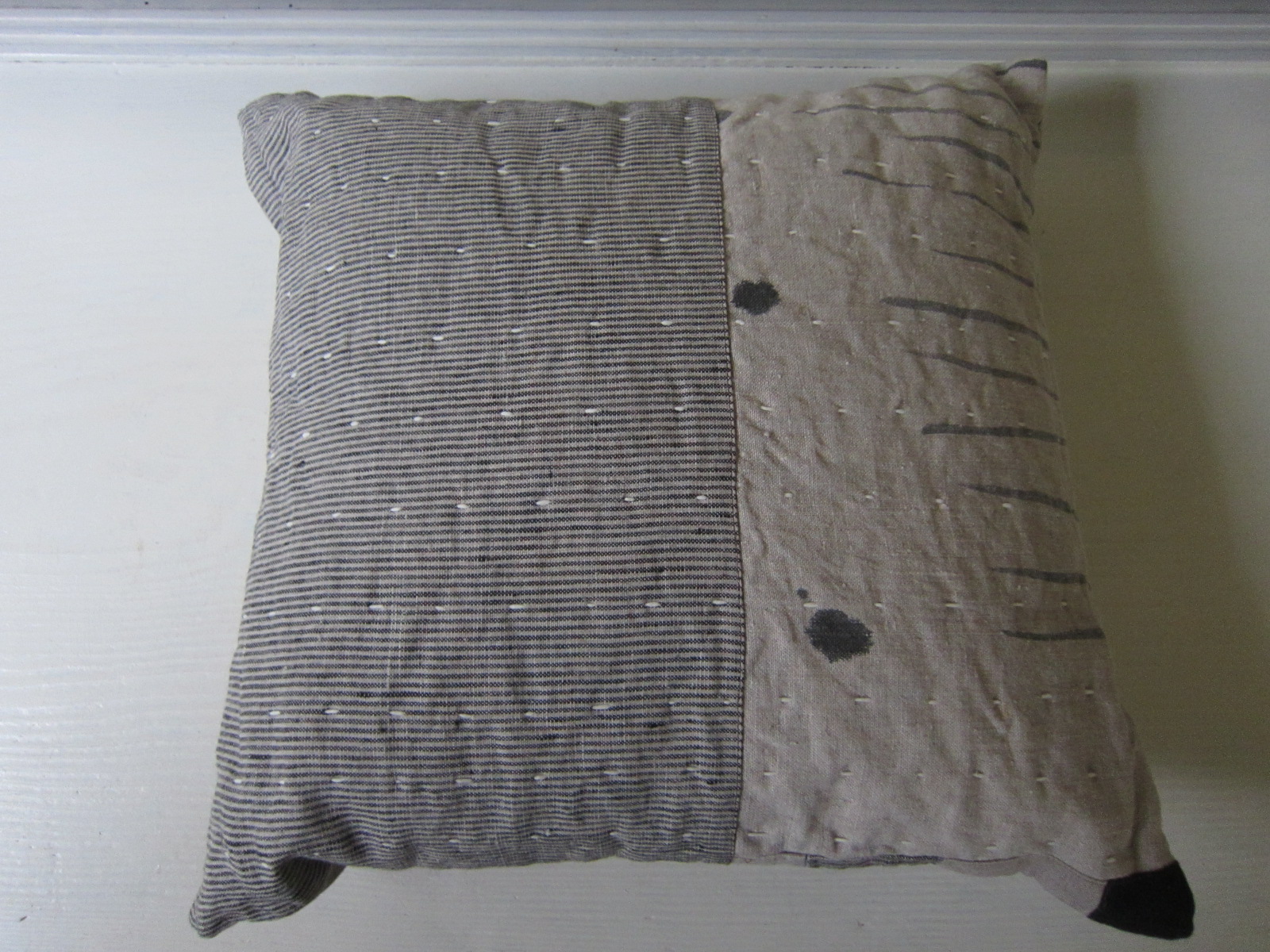 リトアニア麻と墨の線模様や大きなDOTが 絶妙なバランスでマッチしています~。 そして角の黒い布がグッと全体を引き締めています! マイざぶとんとしてどうぞ~。
