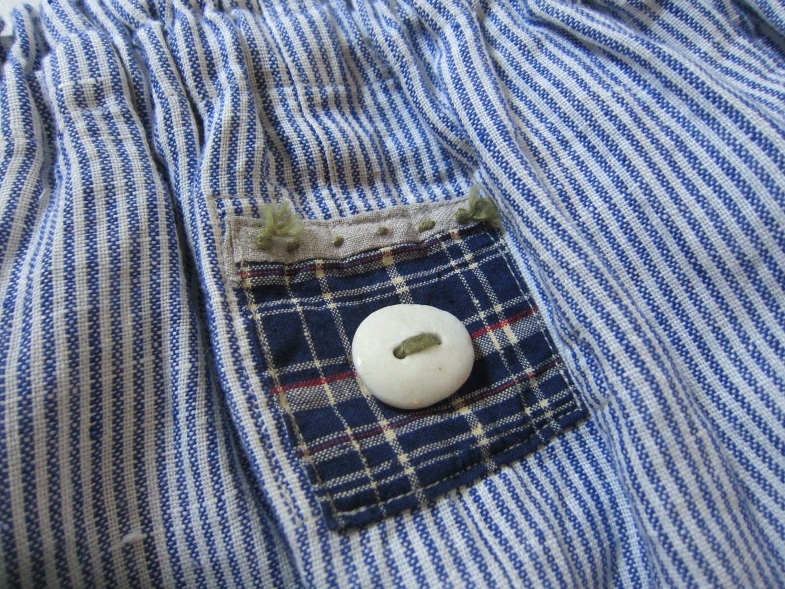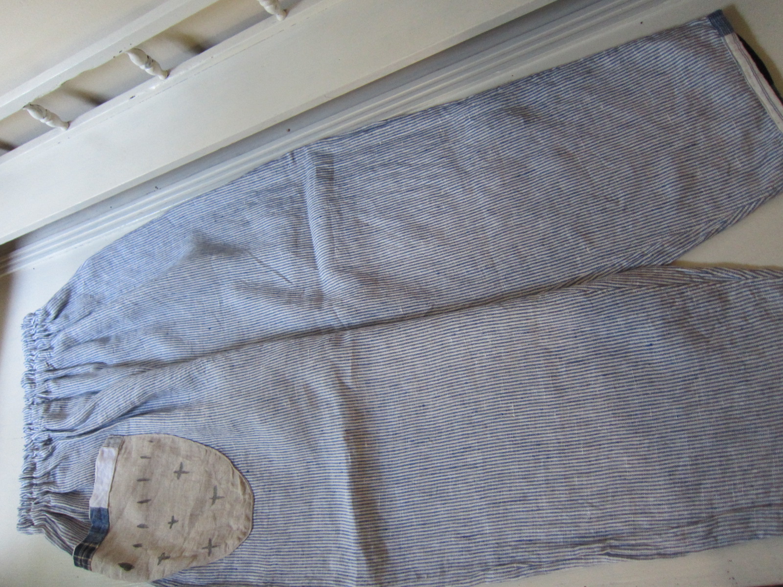 さわやかなブルーストライプのリトアニア麻もんぺです。