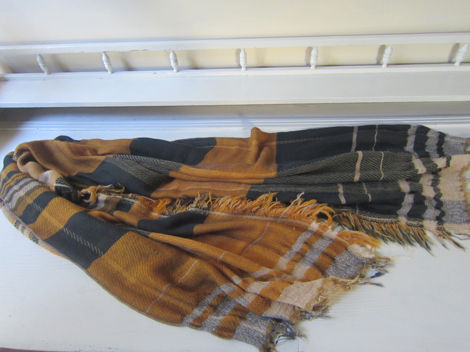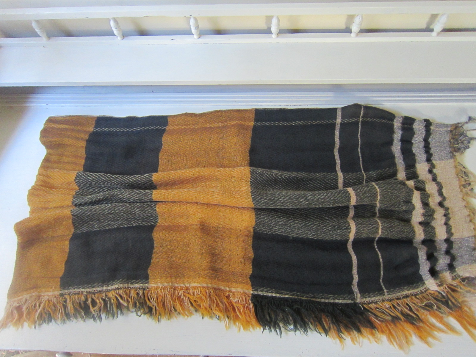 渋いオレンジとグリーンのウールショールです。 やさしい肌触りの大人カラーをお楽しみください。